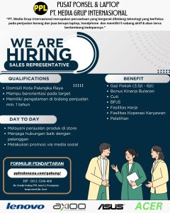 Lowongan Kerja Terbaru Kalimantan Tengah 2025 – PT Media Grup Internasional (PPL/Pusat Ponsel dan Laptop) merupakan perusahaan yang bergerak dibidang teknologi yang berfokus pada penjualan barang dan jasa berupa Handphone, Laptop dan Aksesori gadget lainnya.